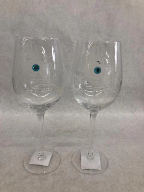 2pc Clear Wine Glasses with Blue Gem Accent and White Feather detail