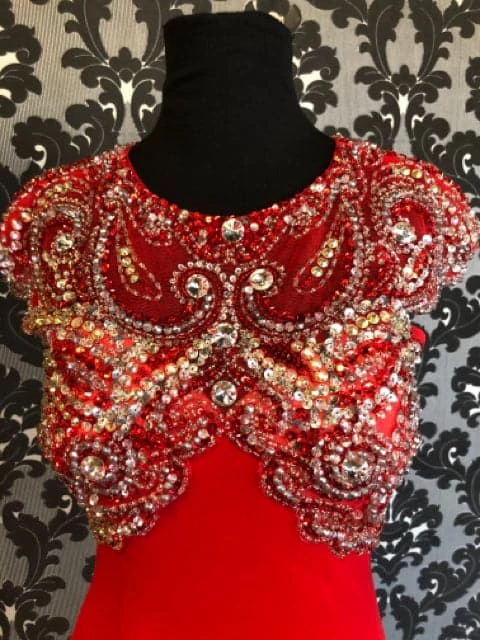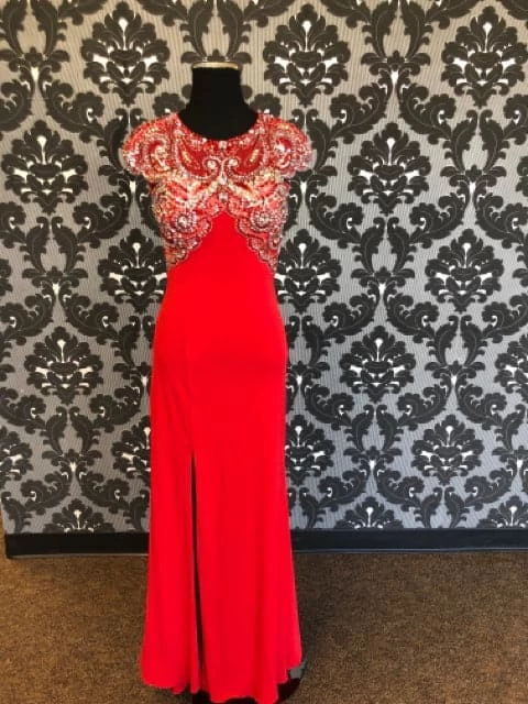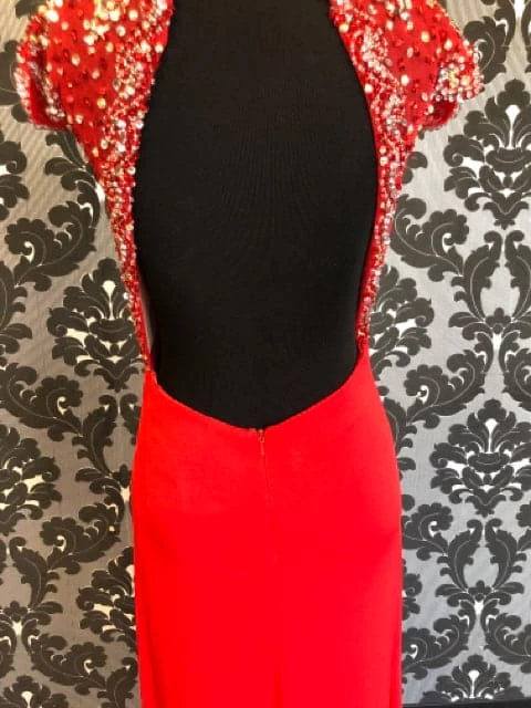 Angela & Alison Size 4 Red Rhinestone Prom Dress with Open back