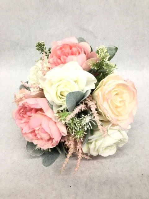 Blush & Ivory Rose, Peony & Baby’s Breath Bouquet w/ Lamb’s Ear Accents & Navy Satin Handle