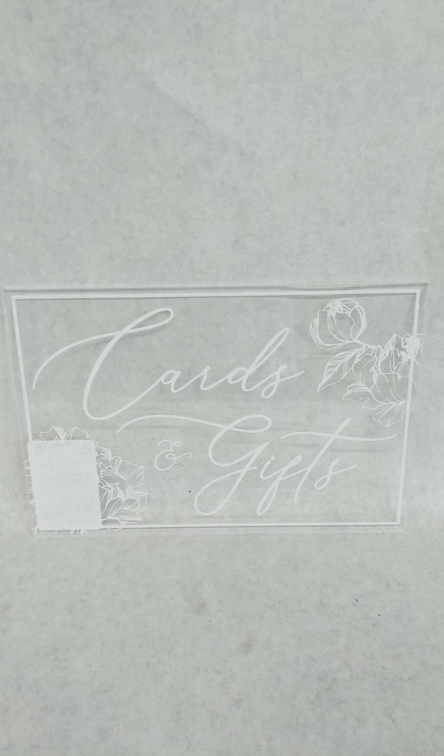 9″x6″ Clear acrylic sign with white “cards & gifts” with floral design