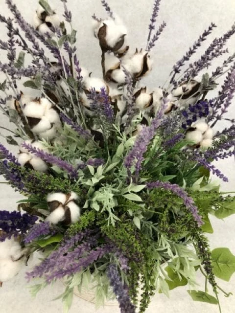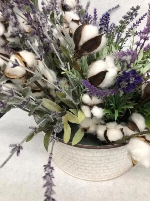 Lavender, Cotton & Greenery Centerpiece in Ivory Metal Planter