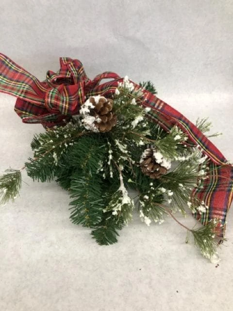 17″ Green/Red/White Plastic Floral Arrangement with Plaid Ribbon