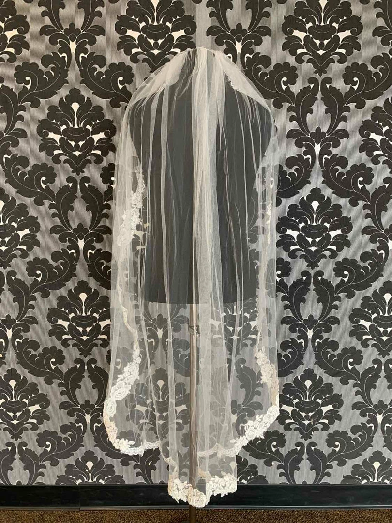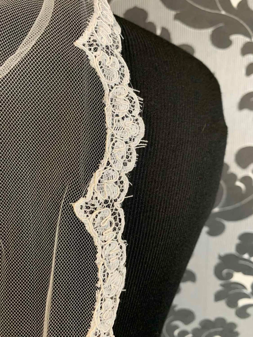 finger tip Ivory Tulle with Lave Edge Veil AS IS SMALL HOLE BY LACE TRIM
