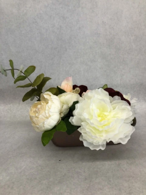 Ivory Burgundy & Blush Floral Arrangement w/ Greenery in Rose Gold Pan