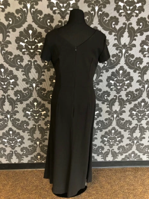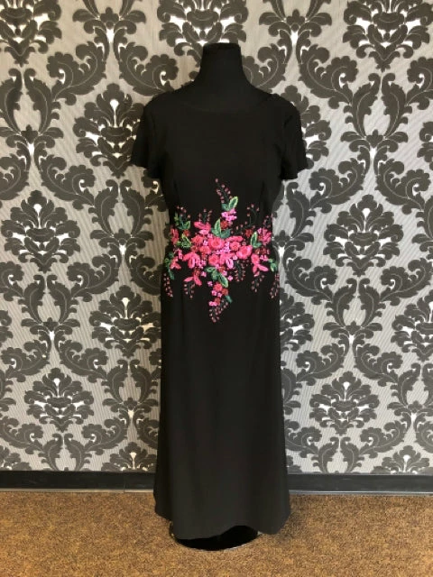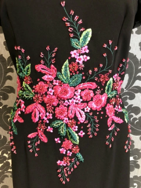 David Meister Size 14 Black Floor Length Cap Sleeve Pink Floral Embroidery