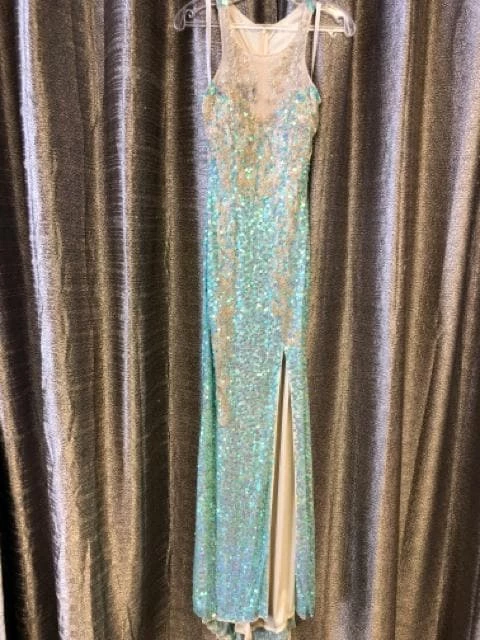 Size 0 Aqua Primavera Sequin w/ High Slit and Illusion Top