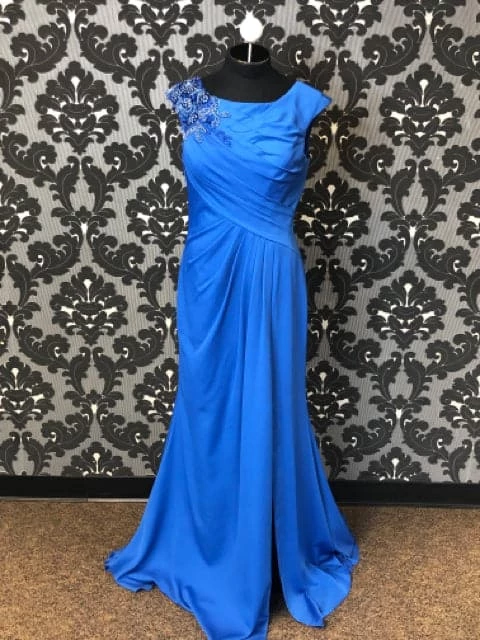 style 117923 high neck with ruched top with beaded one shoulder and side slit with shawl