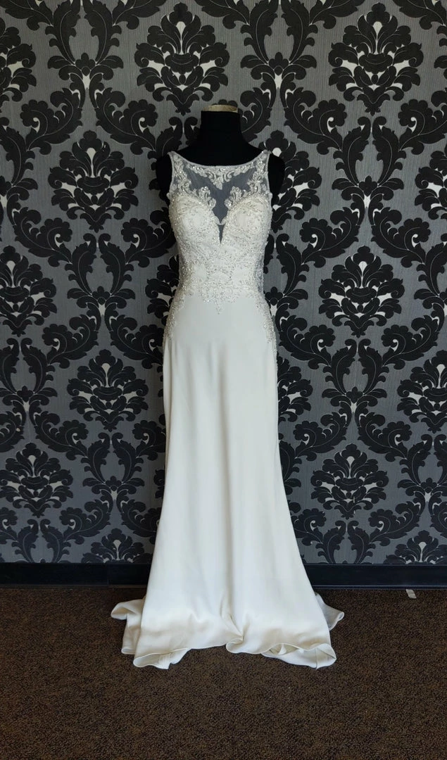 Stacy’s Wedding Dress Size 4 Crepe/Beaded Ivory Highneck Fit & Flare