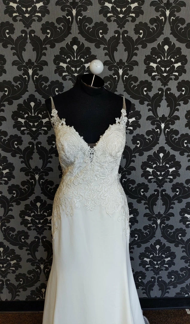 Stella York crepe ivory sleeveless “SIERRA” “AS IS” (Stains, missing eye & hook)