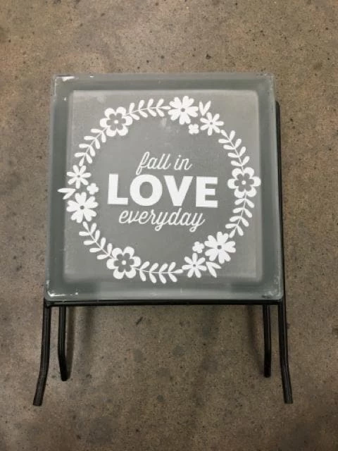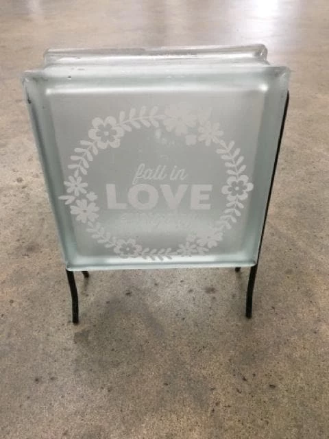 DIY Frosted Glass Block w/ Vinyl “Fall in Love” Accent in Metal Stand