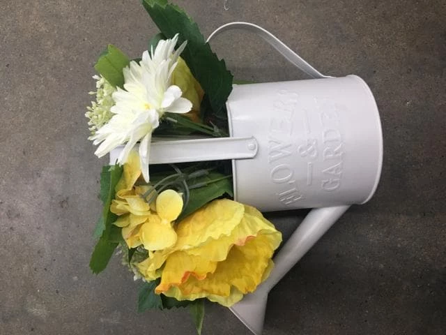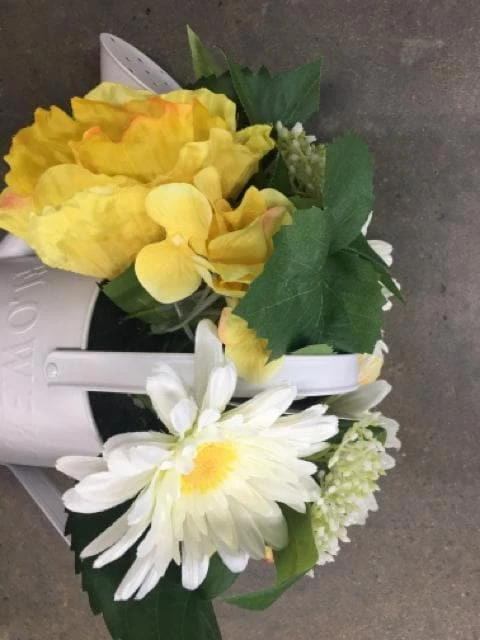Daisy, Peony & Hydrangea Arrangement in White Watering Can