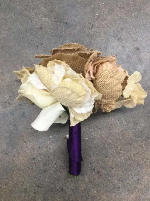 Purple Satin Ribbon Wrapped Burlap & Ivory Bouquet