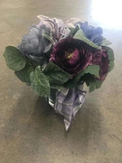 Peony & Hydrangea Arrangement in Ribbon Wrapped Glass Vase